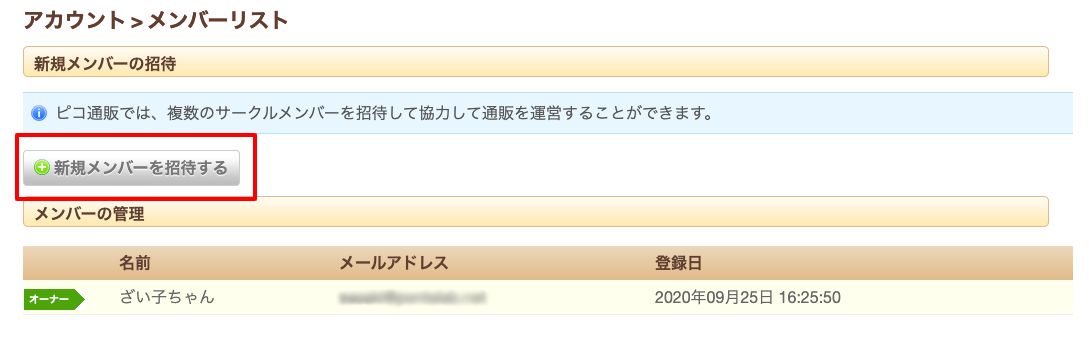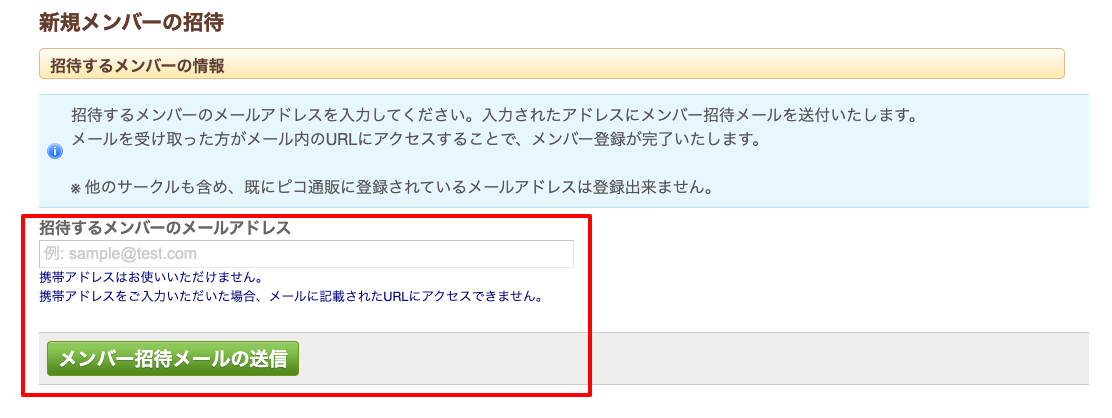 入力したメールアドレスにピコ通販から「メンバー招待のお手続きのご案内」をお送りいたします。記載されたURLをクリックします。