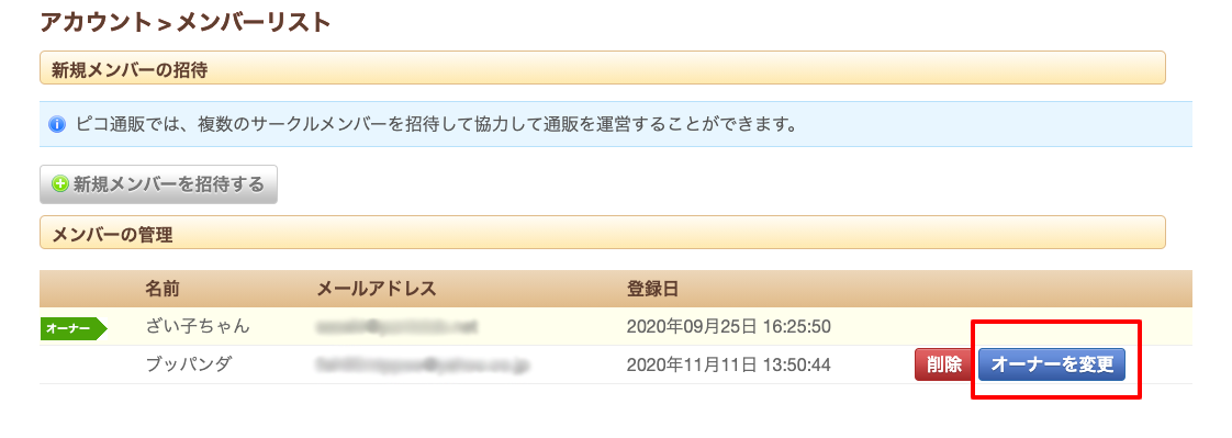 変更するメンバーの「オーナーを変更」をクリックして、サークルオーナーを変更します。
