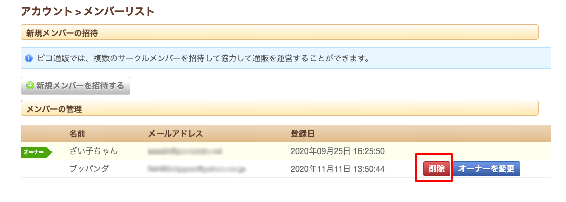 削除したいメンバーの「削除」をクリックして、メンバーを削除します。