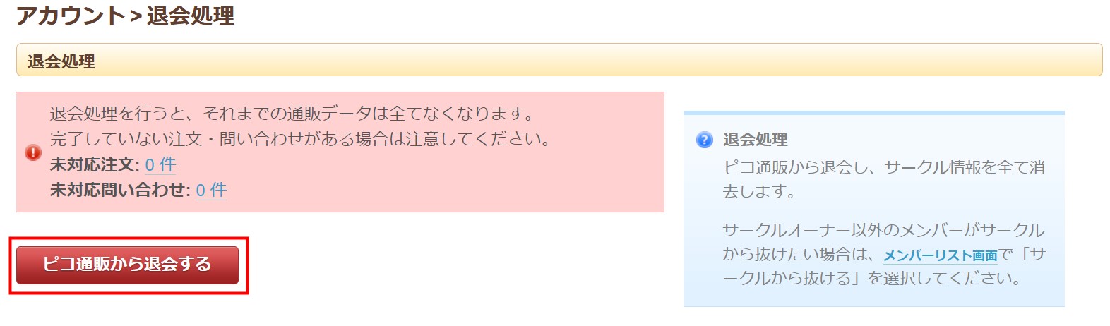 退会処理を行うと、それまでの注文データ・お問い合わせデータは全てなくなります。完了していない注文・問い合わせがある場合は注意してください。また、ピコ通販安心支払いでお支払い済かつ未精算の売上がある場合は、退会することはできません。