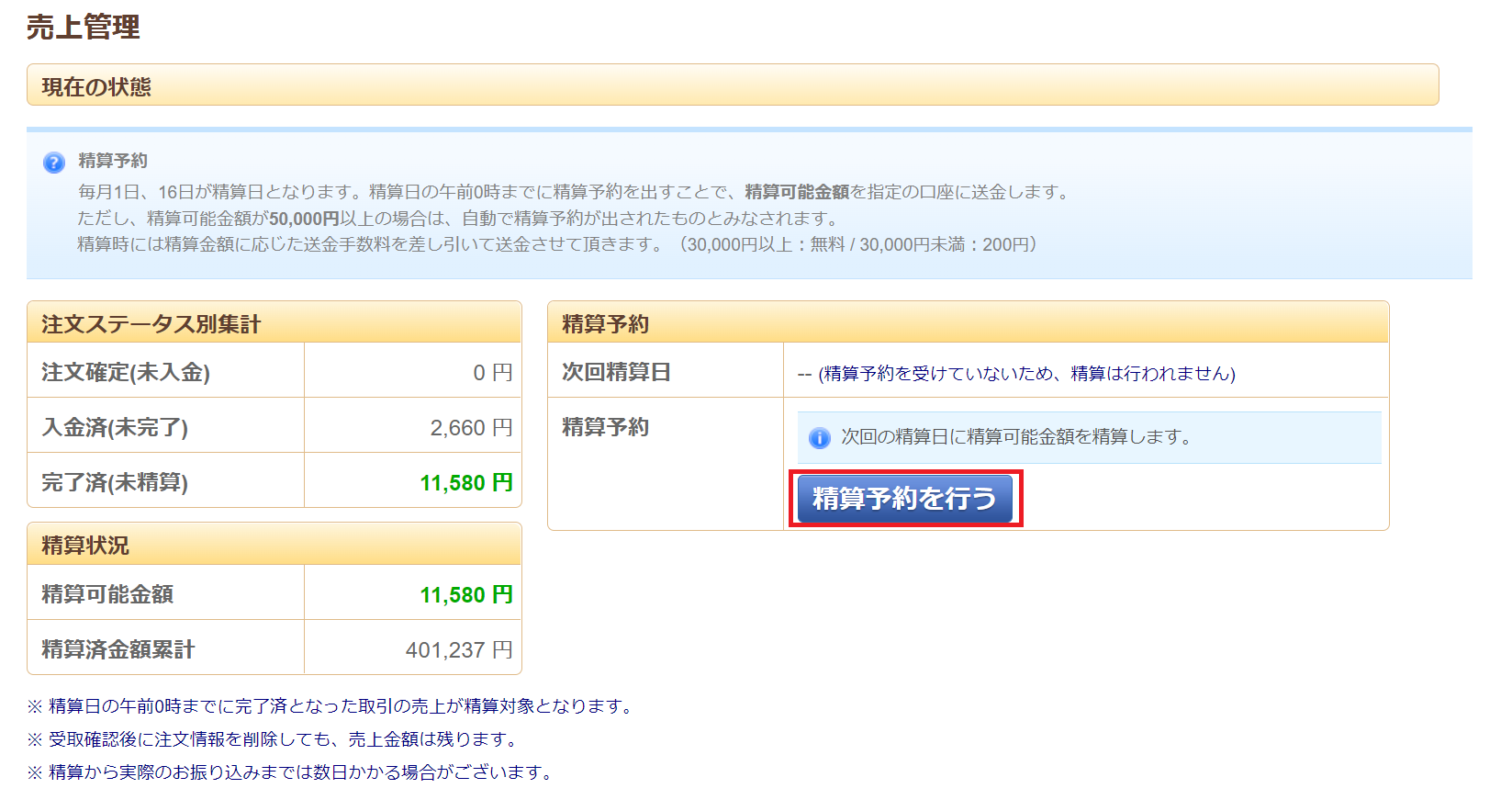 精算予約を行うことで、通販サイトの売上を受け取ること(精算)ができます。精算は毎月2回(1日、16日)行われ、その時点で精算予約を受けている場合に精算処理が行われます。