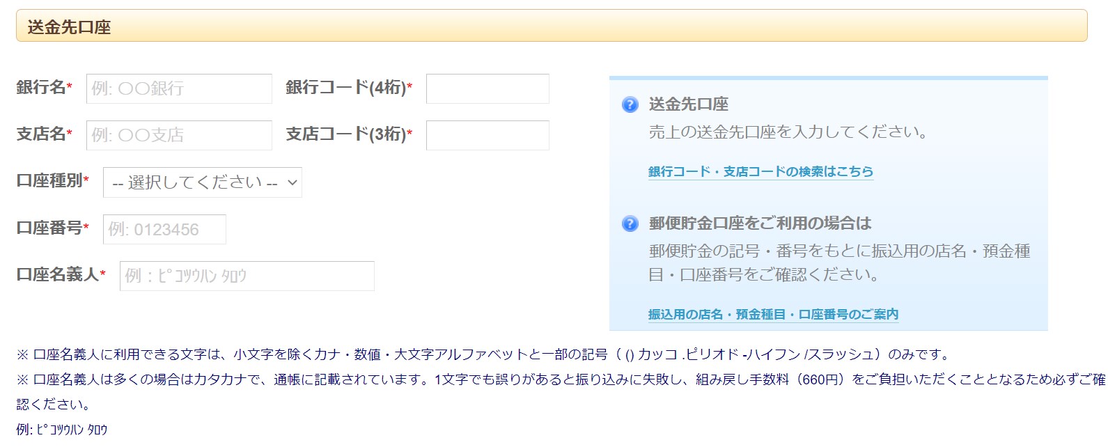 売上の受取先口座です。口座情報が誤っている場合は売上を受け取れません。
