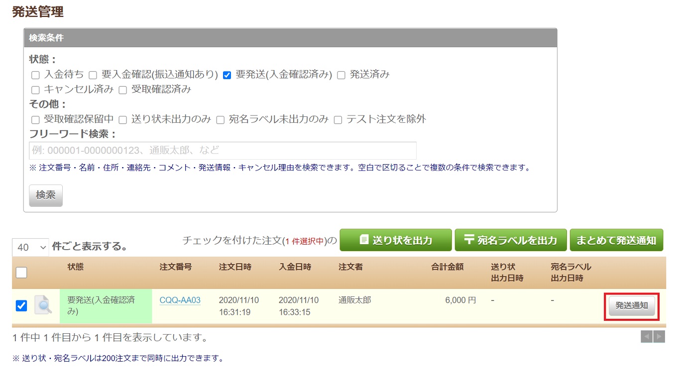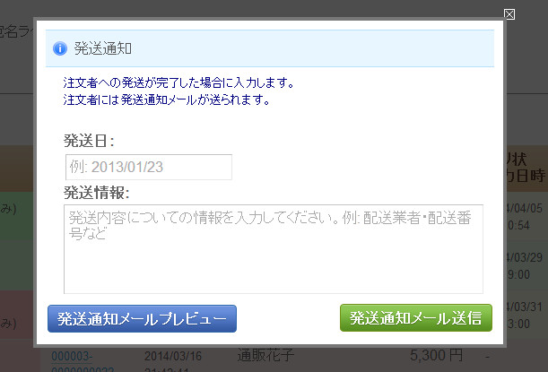 宛名の記入が完了しましたら、発送してください。発送が完了したら、注文者へ発送が完了した旨の通知を行います。一覧の「発送通知」ボタンをクリックしてください。発送通知ダイアログが表示されます。