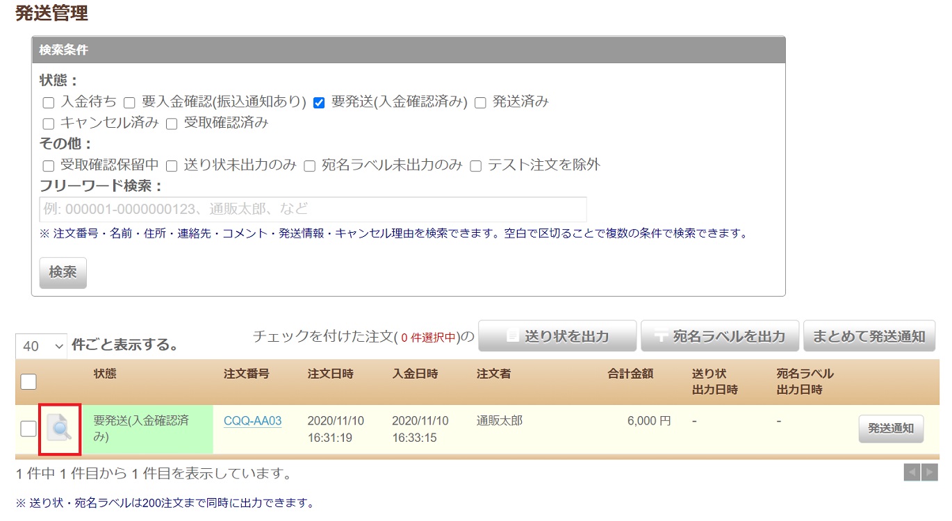 宛名を手書きで記入する場合は、発送管理画面の一覧で虫めがねアイコンをクリックすることで注文者情報を閲覧できます。