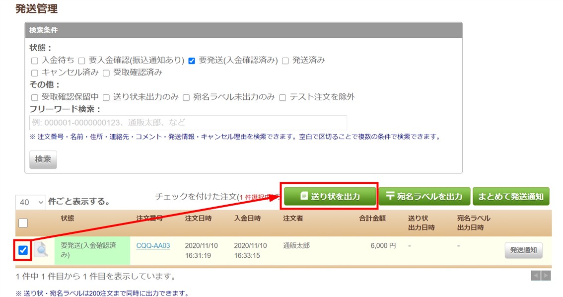 発送管理画面を開き、送り状を出力したい注文にチェックをつけます。画面上部のボタンをクリックすると、選択した注文に関する送り状の出力ダイアログが開きます。