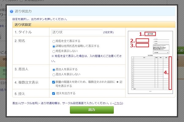 ダイアログが表示されますので、必要箇所にチェックをつけて出力ボタンを押してください。送り状のタイトルは自由に変更できます。(15文字以内)また「控えを出力する」にチェックを入れれば、同一の内容の控えを出力できます。