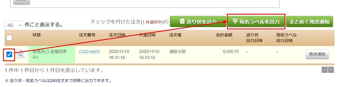 発送管理画面を開き、宛名ラベルを出力したい注文にチェックをつけます。画面上部のボタンをクリックすると、選択した注文に関する宛名ラベルの出力ダイアログが開きます。