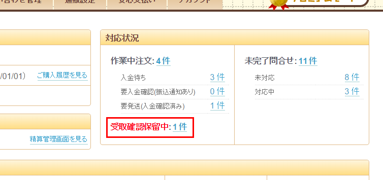 受取確認を保留された注文がある場合はダッシュボードに件数が表示されるため、そちらをクリックすることでも受取確認が保留された注文一覧が確認できます。