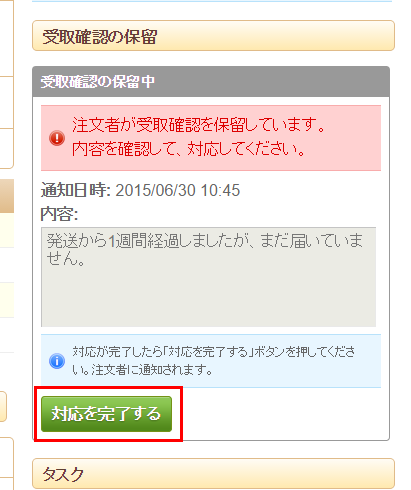 受取確認保留中の注文は、注文詳細画面の右側に「受取確認の保留」セクションが表示されます。注文者様が入力した保留内容もここで確認できます。内容を確認し、対応してください。対応が完了したら、注文詳細画面の「対応を完了する」ボタンを押してください。 注文者様と連絡を取る必要がある場合は、取引履歴のメッセージ送信機能をご利用になると便利です。メッセージ送信機能については、「お問い合わせがきたら」をご覧ください。