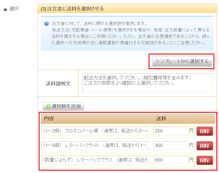 「選択肢を追加」をクリックすると、項目が追加されますので、「内容」「送料」を入力してください。 配送方法や配送先に関してはテンプレートをご用意してあります。