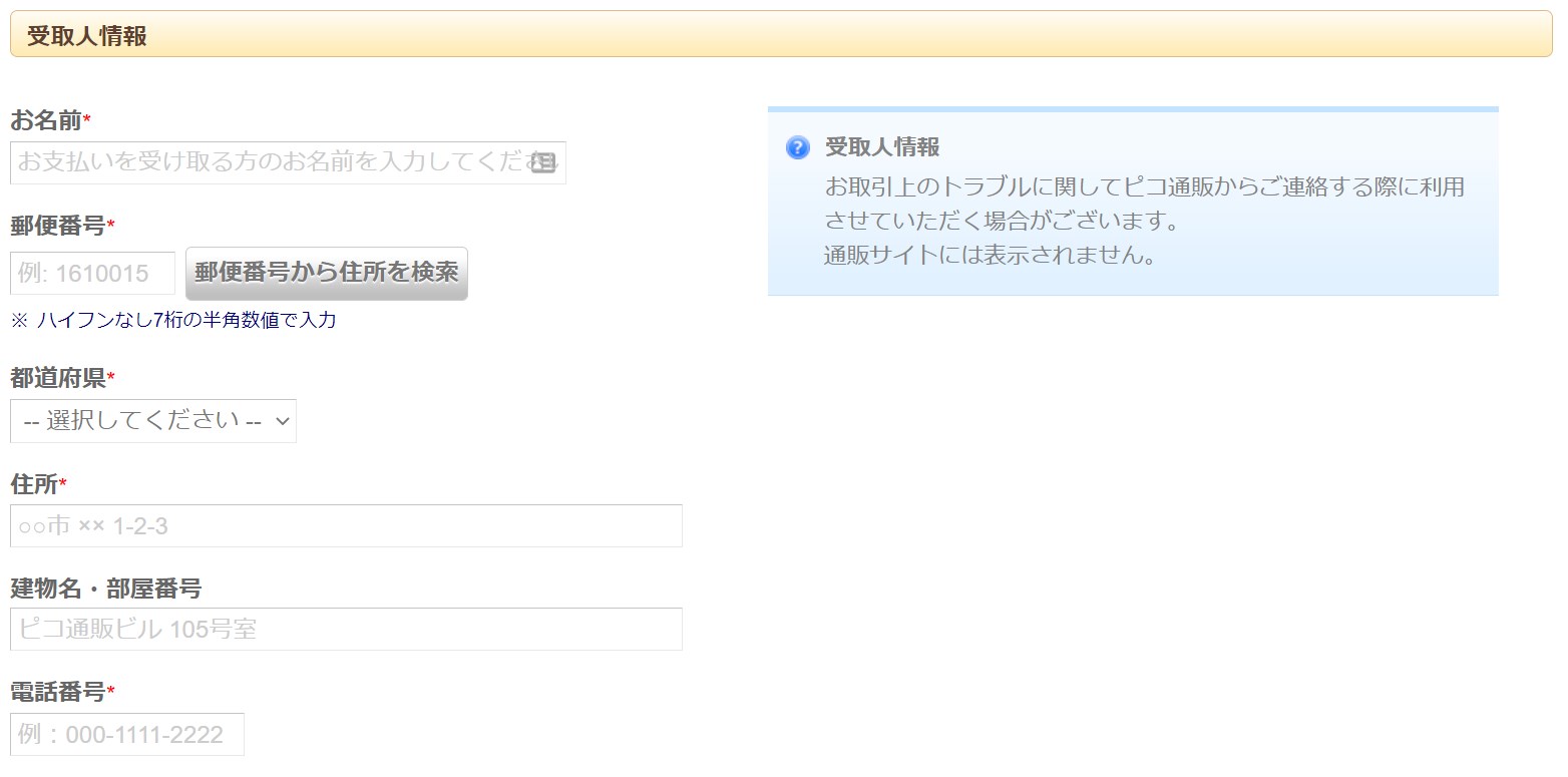 売上を受け取る方の情報です。お取引でトラブルが発生した際に、ピコ通販からご連絡する場合に利用させていただく場合があります。注文者には通知されません。