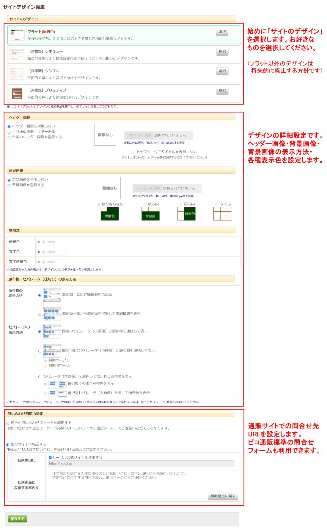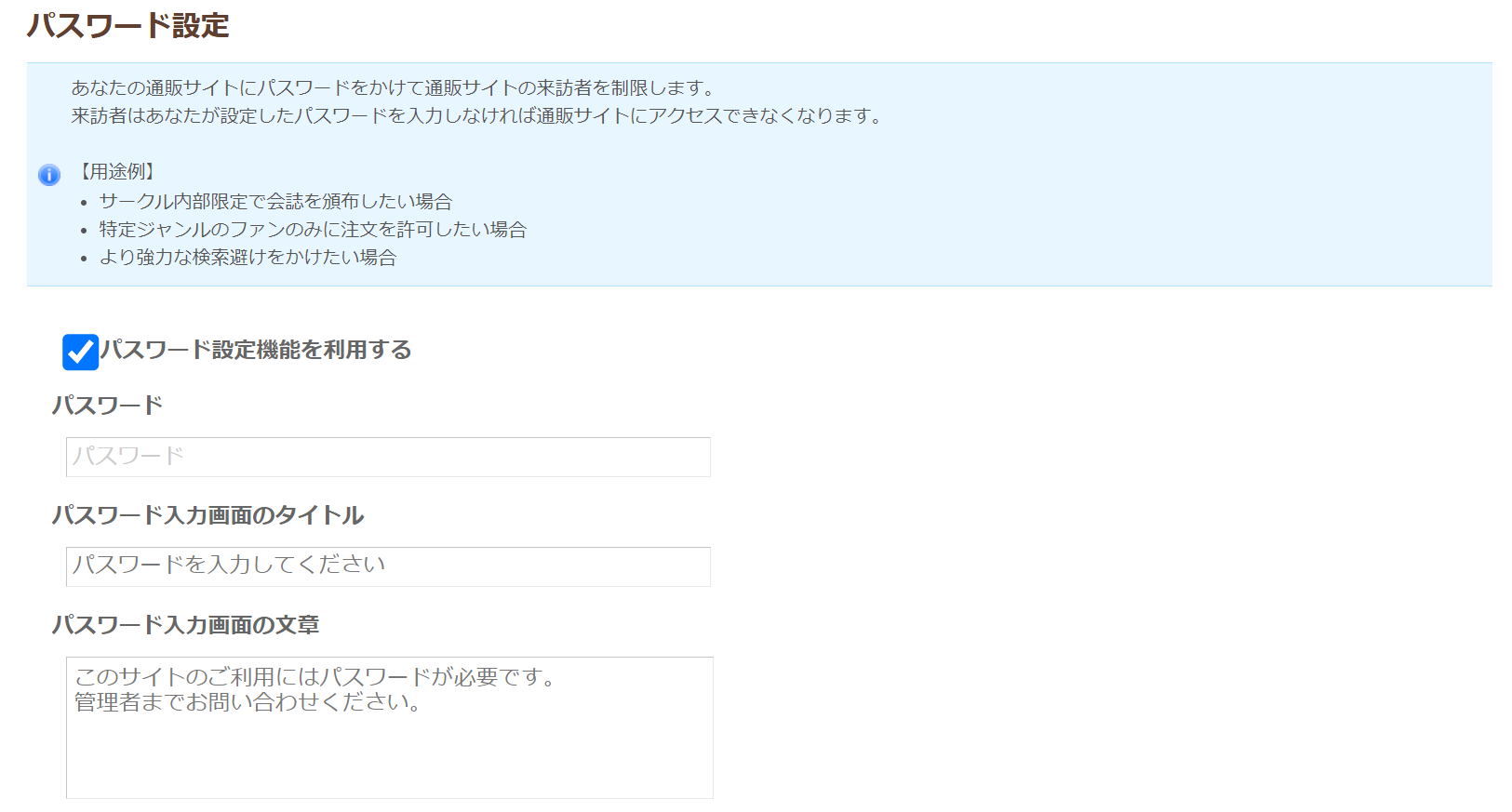サークルを登録した時点で、通販サイトは一般的なサークルの自家通販を想定して設定済です。順番に内容を確認し、あなたのサークルの運営方針に合うように設定を変更しましょう。