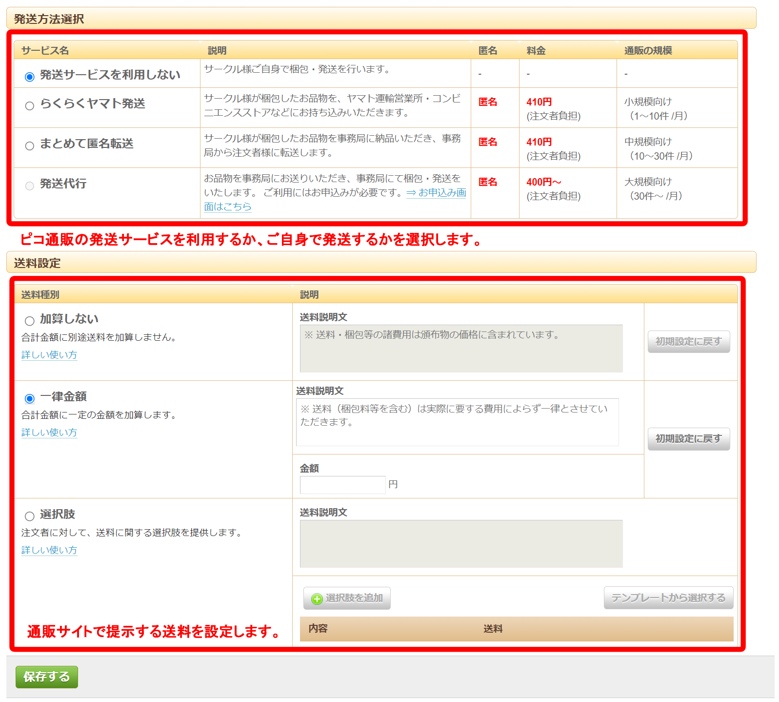 発送に利用するサービスを選択します。サークル様の運営方針に応じて以下からご選択ください。