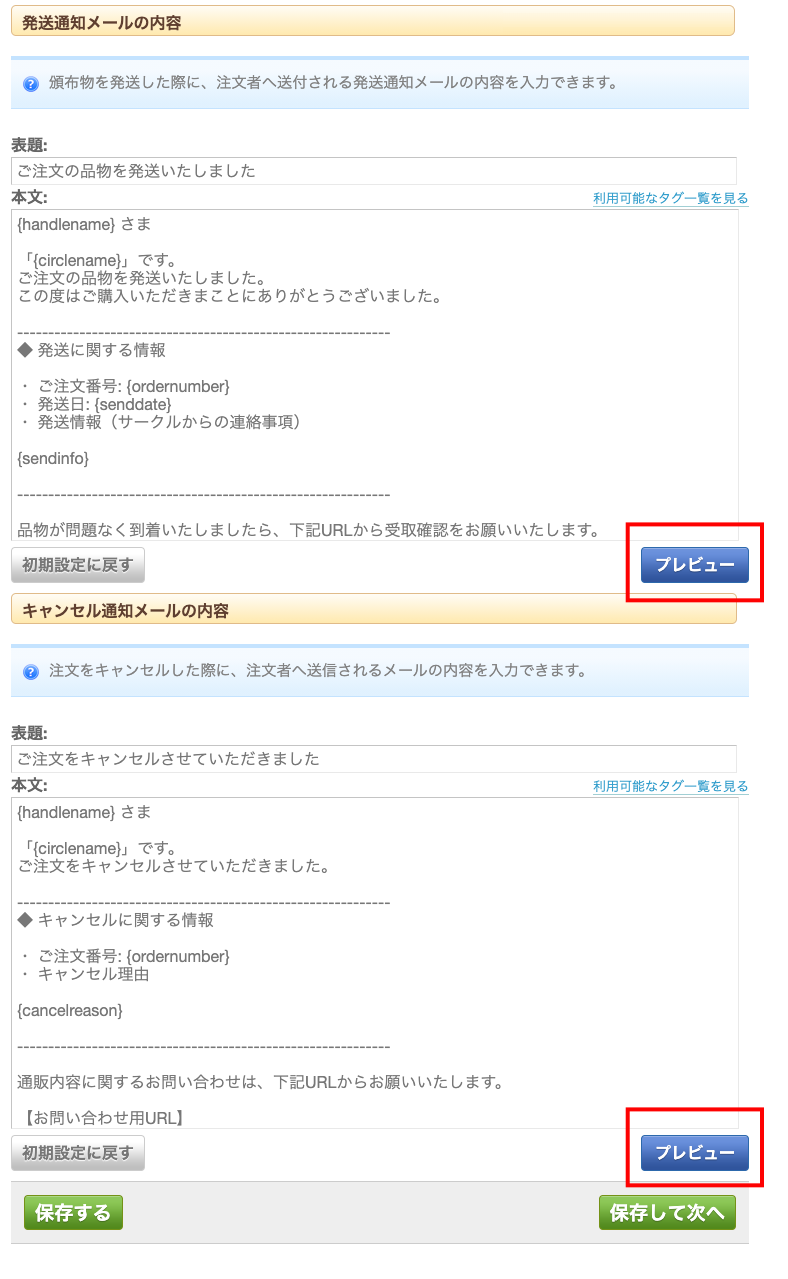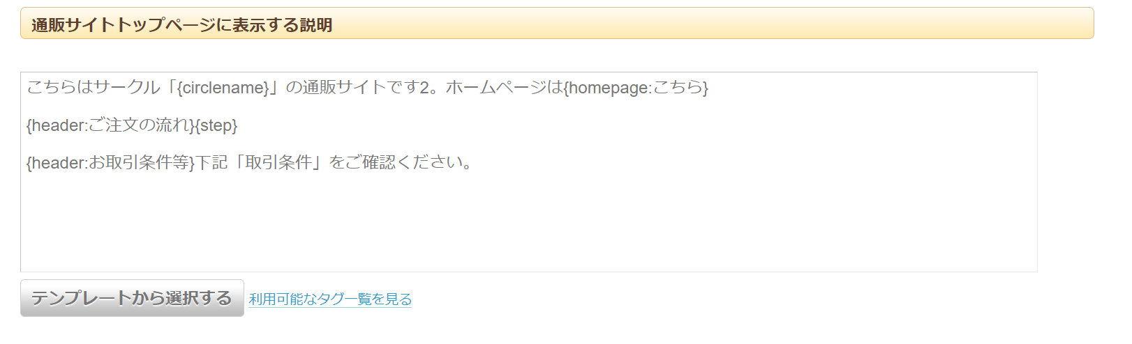 「テンプレートから選択する」ボタンを押すと、基本的な表示を備えたテンプレートから選ぶことができます。テンプレートをお使いの場合でも、日付などの項目はサークル様が編集する必要がありますので、必ず内容を確認しサークル様の通販運営に合う形に修正してください。