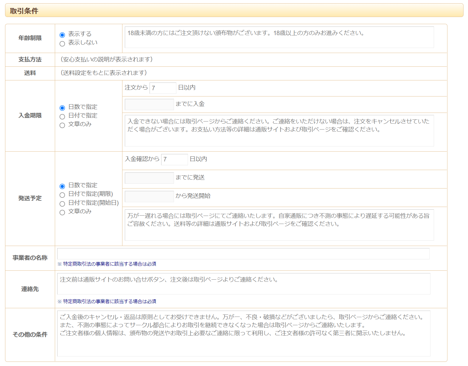サークル様の発送予定を設定します。注文者様への約束になりますので、ここに設定した期日内での発送をしてください。入金確認日からの日数で指定、特定の日付での指定、または文章のみでの表示が可能です。事業者の名称