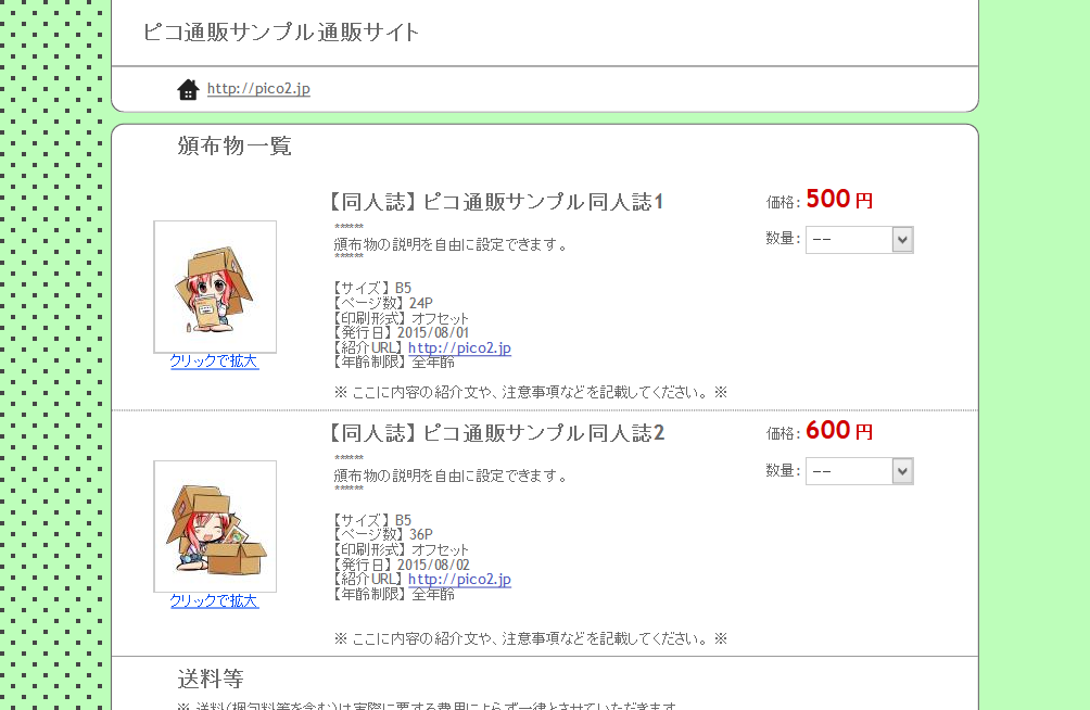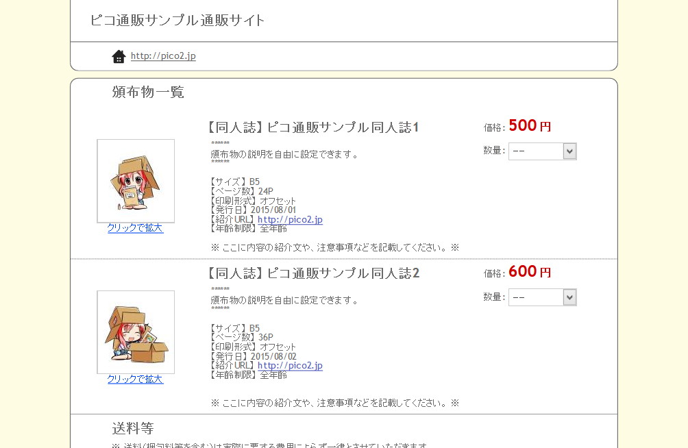 ピコ通販の機能・デザイン例をご確認ください。デモサイトは設定の一例であり、サークル様の通販スタイルに合わせてカスタマイズできます。